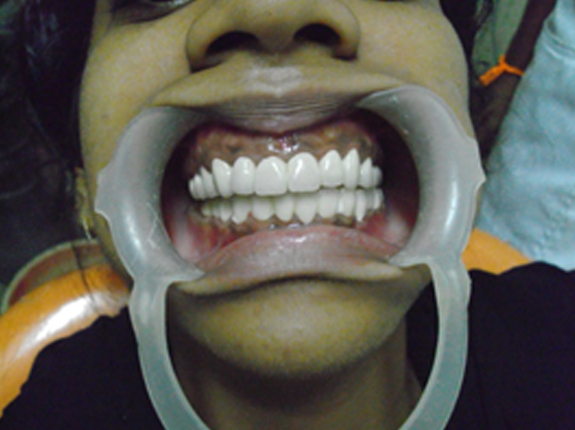 All ceramic crowns were done to the upper and lower arch to improve the smile and to avoid carries